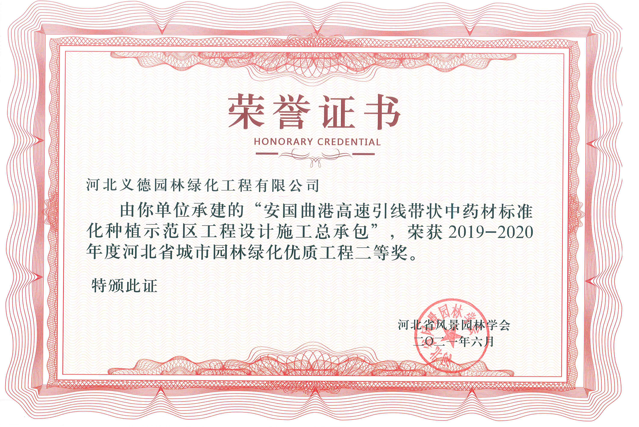 近幾年來我公司被授予2019年-2022年河北省扶貧龍頭企業(yè)、2018年國(guó)家林業(yè)標(biāo)準(zhǔn)化示范企業(yè)、2019年度全國(guó)苗圃50強(qiáng)、2018-2019年度河北省林業(yè)重點(diǎn)龍頭企業(yè)、2018年保定市精品特色現(xiàn)代農(nóng)業(yè)園區(qū)、2018年度保定林木種苗協(xié)會(huì)授予特色苗圃、2018年度北方十佳特色苗圃、2016-2019年河北省建設(shè)工程招標(biāo)投標(biāo)誠(chéng)實(shí)守信5A級(jí)施工企業(yè)等榮譽(yù)稱號(hào),2017年保定市林木種苗龍頭企業(yè)、石家莊市2017年度優(yōu)秀園林企業(yè)。